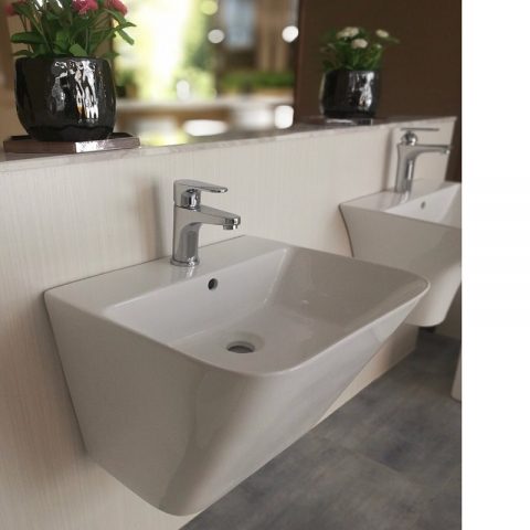 Chậu lavabo treo tường liền chân vát dài KB-2801TTQ thiết kế hiện đại, sang trọng. Phù hợp mọi không gian phòng tắm.