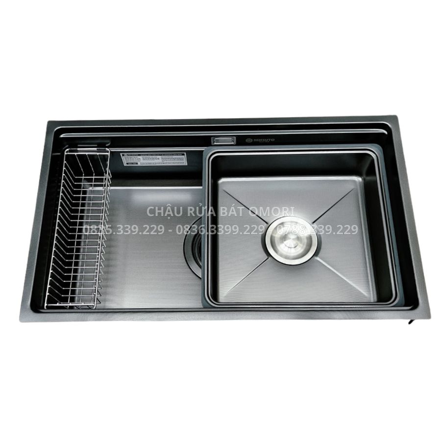 - Thiết kế hiện đại với gờ hạ bậc – tích hợp phụ kiện thông minh: Siphon, giá úp bát inox, chậu rửa nhỏ, thớt inox, thớt inox lỗ , giá xà phòng.