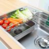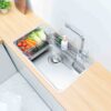 - Thiết kế gờ hạ bậc thông minh cho phép các phụ kiện: giá đỡ, khay rửa, thớt,… có thể di chuyển mượt mà, tối ưu hóa không gian và hiệu quả sử dụng.