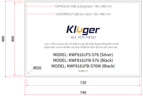 Bán âm: W740 x D480 (mm) hèm sâu 3.8 – 4.0 (mm).