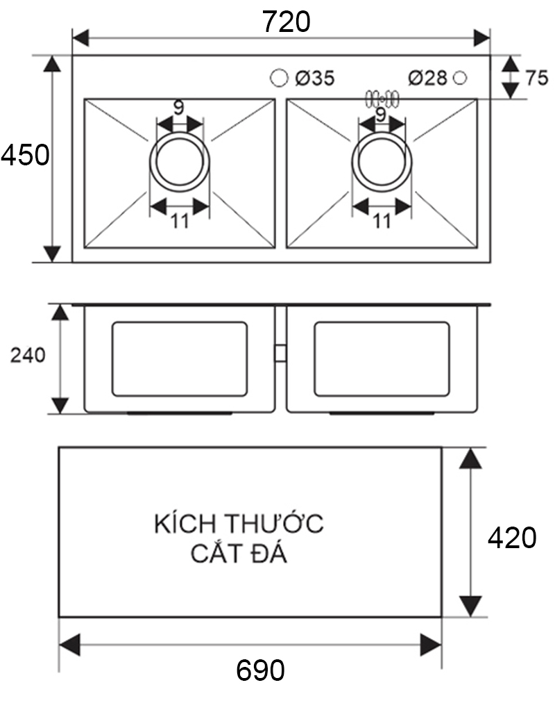 Có 2 lỗ vòi (vòi rửa bát, vòi lọc) chờ lắp đặt