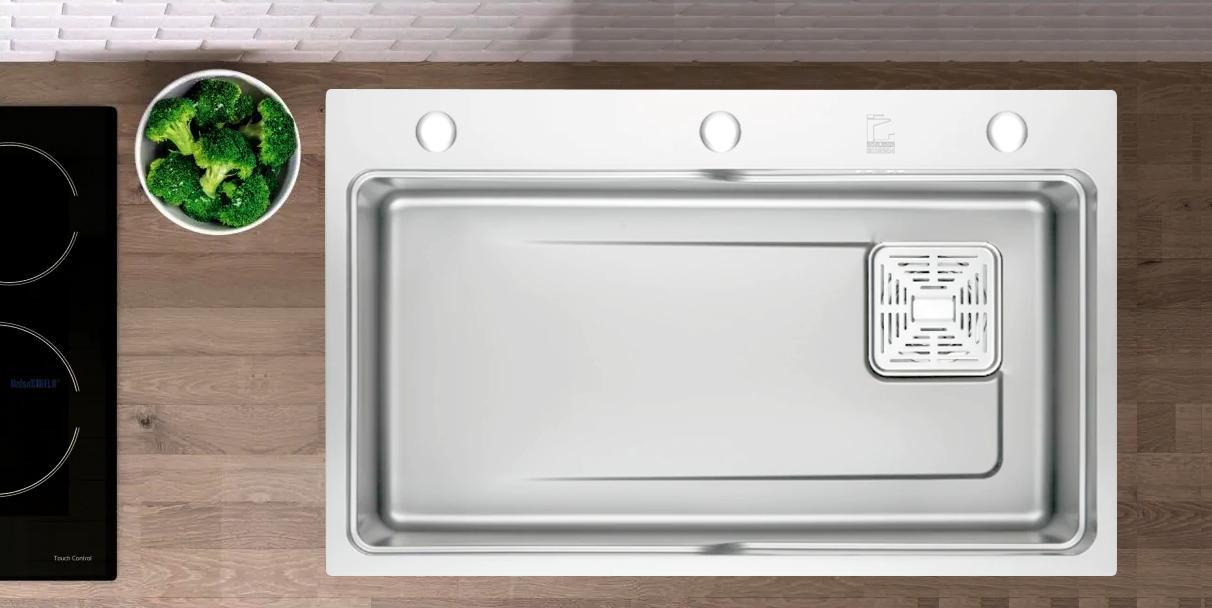 Có 3 lỗ vòi (vòi rửa bát, bình đựng nước rửa, vòi nước lọc) chờ lắp đặt