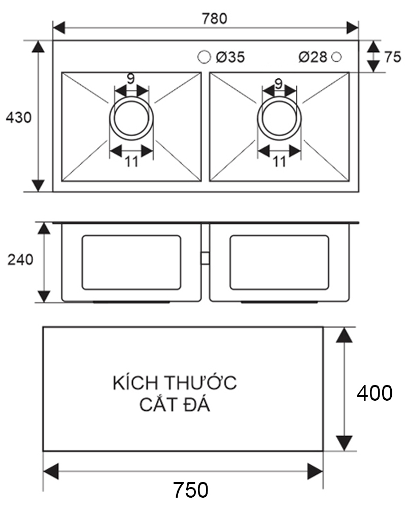 - Có 2 lỗ vòi (vòi rửa bát, vòi nước lọc hoặc bình đựng nước rửa gắn chậu) chờ lắp đặt