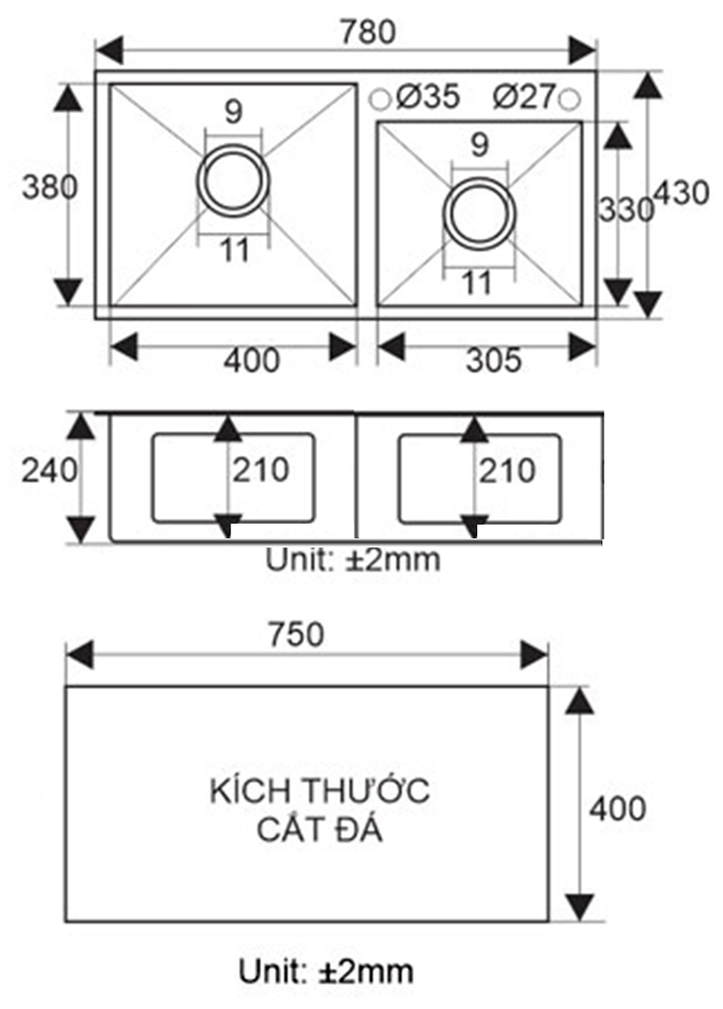 • Có 2 lỗ vòi (vòi rửa bát, vòi nước lọc hoặc bình đựng nước rửa gắn chậu) chờ lắp đặt
