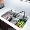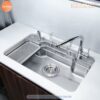 - Lòng chậu sâu, hố chậu lớn, được thiết kế gờ hạ bậc thông minh, cho phép tích hợp phụ kiện làm bếp như thớt, rổ, chậu mini,… giúp bạn tiết kiệm thời gian làm bếp hiệu quả