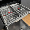 - Các loại đĩa thìa, người dùng có thể cho vào vào giỏ màu xám ở trong khay rửa trên cùng hoặc xếp làm ngang, sao cho các không có bất cứ vật dụng nào cản trở vào tay quay gạt nước của máy.